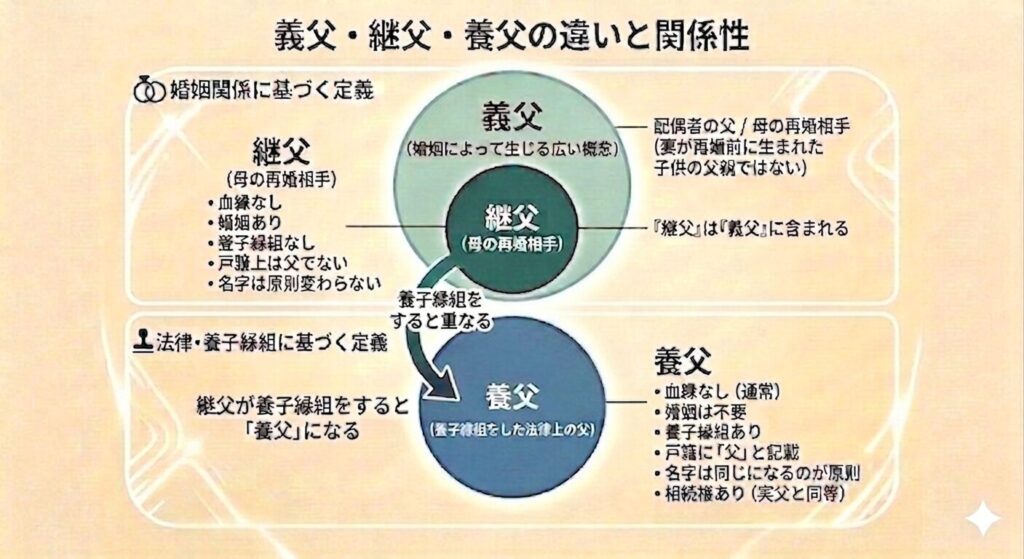 「義父」「継父」「養父」が混同されやすい理由として、これらが状況によって重なりうるためです。
